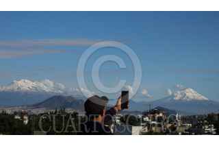 CIUDAD DE MÉXICO, 13ENERO2025.- Un capitalino toma fotografías de la postal que se puede apreciar de los volcanes Iztaccíhuatl y Popocatépetl durante el di.de hoy. FOTO: GRACIELA LÓPEZ/CUARTOSCURO.COM