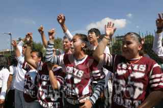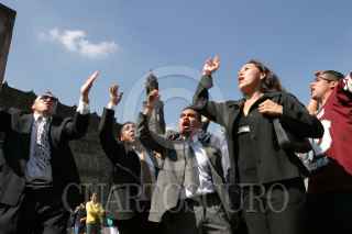 MEXICO,D.F.,02OCTUBRE2007.- En la plaza de la Tres Culturas en Tlatelolco, la Organización Democratica de estudiantes técnicos del Instituto Politécnico Nacional dejaron una ofrenda con motivo de la conmemoración del 02 de octubre. En la imagen, estudiantes politécnicos gritan porras en honor a los estudiantes muertos en el 68. FOTO:ROCIO ORTIZ/CUARTOSCURO.COM