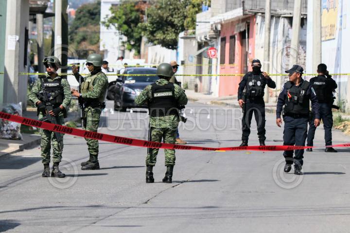 JIUTEPEC, MORELOS, 16ENERO2025.- Asesinan a balazos a tres mujeres en la calle Nardos de la colonia El Edén. Dos de ellas policías del municipio de Cuernavaca, una comandante y su escolta y una menor de edad, hija de una de las policías. El ataque ocurrió pasadas las 10:40 de la mañana cuando las mujeres circulaban en la calle referida a bordo de un vehículo color negro cuando fueron atacadas por los ocupantes de dos camionetas, en el sitio peritos de la Fiscalía de Justicia de Morelos embalaron 17 casquillos calibre 9 milímetros. Los homicidas dejaron sobre el cofre del auto un mensaje escrito en una cartulina. FOTO: MARGARITO PÉREZ RETANA/CUARTOSCURO.COM