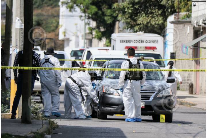 JIUTEPEC, MORELOS, 16ENERO2025.- Asesinan a balazos a tres mujeres en la calle Nardos de la colonia El Edén. Dos de ellas policías del municipio de Cuernavaca, una comandante y su escolta y una menor de edad, hija de una de las policías. El ataque ocurrió pasadas las 10:40 de la mañana cuando las mujeres circulaban en la calle referida a bordo de un vehículo color negro cuando fueron atacadas por los ocupantes de dos camionetas, en el sitio peritos de la Fiscalía de Justicia de Morelos embalaron 17 casquillos calibre 9 milímetros. Los homicidas dejaron sobre el cofre del auto un mensaje escrito en una cartulina. FOTO: MARGARITO PÉREZ RETANA/CUARTOSCURO.COM