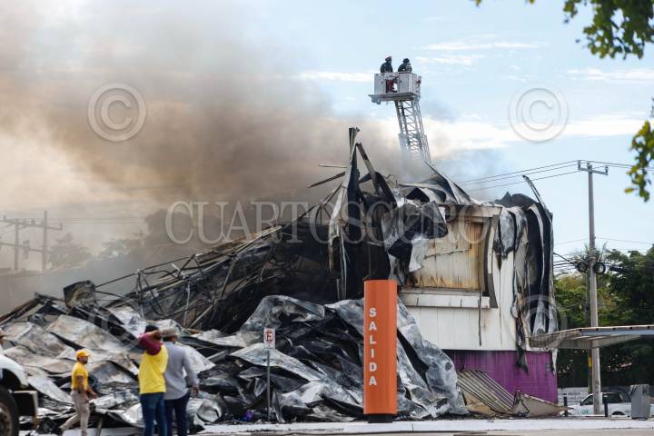 CULIACÁN, SINALOA, 16ENERO2025.-El coordinador de Protección Civil de Sinaloa, Roy Navarrete Cuevas, informó sobre un incendio en una conocida plaza comercial, probablemente causado por trabajos de soldadura, que dejó una persona lesionada con quemaduras y dos más atendidas por shock nervioso. Aún no se ha confirmado si los afectados eran empleados del lugar o personal externo, y las investigaciones determinarán oficialmente las causas del incendio. Navarrete indicó que el fuego fue controlado en un 90%, aunque lamentablemente las pérdidas en el área afectada fueron totales. FOTO: JOSÉ BETANZOS/CUARTOSCURO.COM