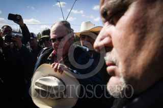 CIUDAD JUÁREZ, CHIHUAHUA, 17ENERO2025.- Julián LeBarón, junto a un grupo de menonitas, se manifestaron en las inmediaciones Puente Internacional Córdova de las Américas por la detención de Johan (ciudadano menonita) por parte de la Fiscalía General de la República (FGR) al acusarlo de presunta extracción ilegal de gasolina. Johan que ya se encuentra en libertad indicó que fue detenido tras negarse a pagar una presunta extorsión, además de que su domicilio fue saqueado, denunciando una sustracción de más de cien mil pesos en efectivo y equipo. FOTO: MARIO JASSO/CUARTOSCURO.COM