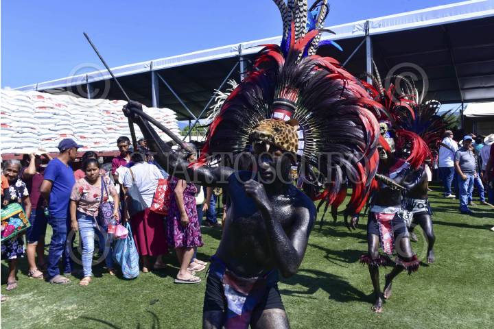 SAN LUIS ACATLÁN, ,GUERRERO, 18ENERO2025. Danzantes y bandas de música de viento dieron la bienvenida a la presidenta de México Claudia Sheinbaum Pardo, con las tradicionales danzas de El Toro de Petate y Los Apaches, en el municipio de San Luis Acatlan, danzas tradicionales del estado de Guerrero. FOTO: CARLOS CARBAJAL.