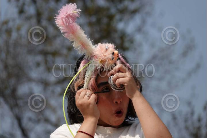 CIUDAD DE MÉXICO, 19ENERO2025.- Con un changuito en la cabeza, una joven se maquilla en el Bosque de Chapultepec. FOTO: GRACIELA LÓPEZ/CUARTOSCURO.COM