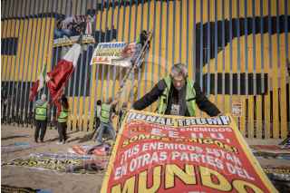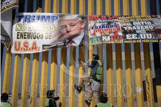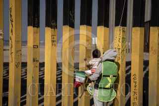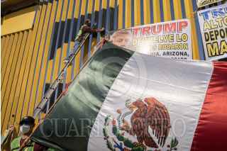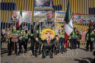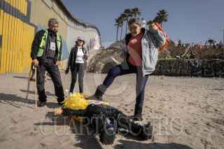 TIJUANA BAJA CALIFORNIA, 19ENERO2025.- A horas de la segunda llegada de Donald Trump a la presidencia de Estados Unidos, un grupo de migrantes y activistas se manifiestaron frente al muro fronterizo en Playas de Tijuana. Con pancartas y lonas con frases en contra de la presidencia de Trump, los protestantes exigieron a las autoridades estadounidenses que no se cancele el programa CBP One y no se realicen las deportaciones masivas. José Maria García Lara, director de Alianza Migrante reconoció que no todas las deportaciones se realizarían de forma legal lo que generará un conflicto mayor en la franja fronteriza de México con los Estados Unidos y que con esta acción estaría separando familias. Comentó que muchas de las personas que estarían en riesgo de ser deportadas de realizarse la acción migratoria propuesta por Donald Trump son contribuyentes a la economía de esa nación, además recordó que en su anterior mandato el presidente norteamericano no repatrió a la cantidad de personas que prometió que enviaría a México. Durante la manifestación los activistas aseguraron que Donald Trump actúa como un niño haciendo berrinche por lo que lo castigaron dándole unas nalgadas y por lo menos tres golpes con un cinturón, aseguraron que habrá más movilizaciones en las que podrían prenderle fuego a la piñata. FOTO: OMAR MARTÍNEZ/CUARTOSCURO.COM