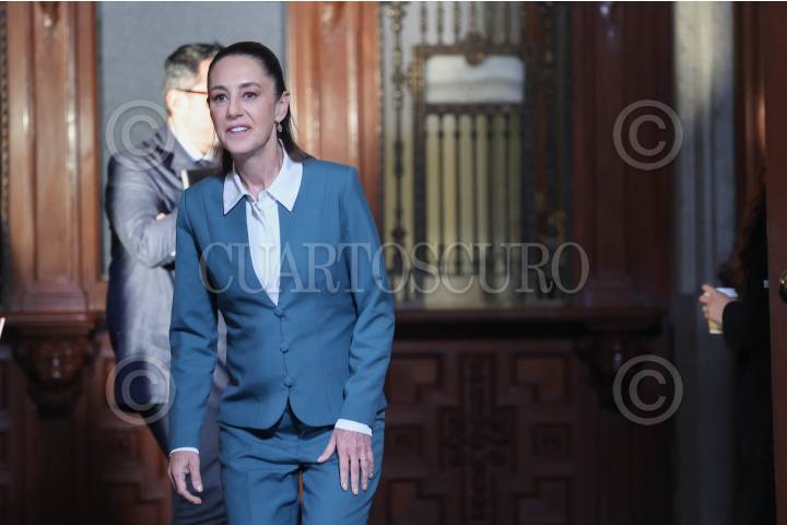 CIUDAD DE MÉXICO, 20ENERO2025.- Claudia Sheinbaum, Presidenta de México, encabezó la mañanera del pueblo, en la que se dio a conocer la estrategia del gobierno federal a través de la SRE para atender a los mexicanos radicados en Estados Unidos, esto la puesta en marcha de redadas para deportarlos tras la llegada del Presidente Donald Trump. FOTO: MOISES PABLO/CUARTOSCURO.COM