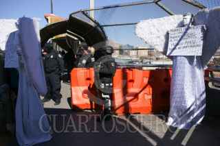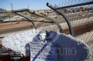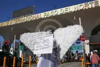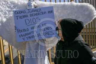 CIUDAD JUÁREZ, CHIHUAHUA, 23ENERO2025.- El colectivo Ángeles Mensajeros se reunió en el puente internacional Santa Fe para brindar apoyo a los migrantes que quedaron varados tras la cancelación de sus citas migratorias en Estados Unidos. Vestidos como ángeles y portando mensajes de esperanza, los integrantes ofrecieron café y comida a las personas deportadas mientras pedían al gobierno mexicano permisos laborales temporales para quienes permanecen en territorio nacional. “Ciudad Juárez es una tierra de oportunidades para quienes buscan salir adelante”, declaró Carlos Mayorga, líder del grupo.. FOTO: CARLOS SÁNCHEZ COLUNGA/CUARTOSCURO.COM