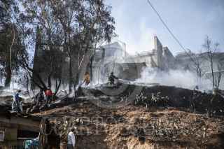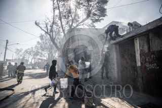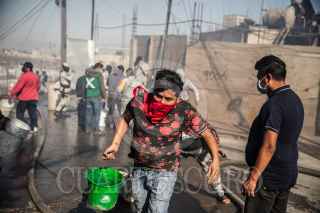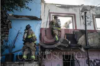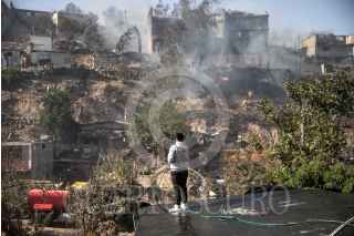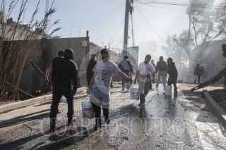 TIJUANA BAJA CALIFORNIA 23ENERO2025.- Hombre con manguera mojando la zona de su casa frente al incendio. Un incendio devastador en la colonia Leandro Valle, Tijuana, dejó un saldo de 30 viviendas completamente destruidas y una persona fallecida. El siniestro, que se inició al mediodía, se extendió rápidamente debido a los vientos de Santa Ana, complicando los esfuerzos de mitigación. Al menos 40 bomberos, junto con Protección Civil, Guardia Nacional, Ejército Mexicano y vecinos de la zona, intervinieron para controlar el fuego. A pesar de sus esfuerzos, el incendio se propagó a varias casas, dejando una estela de destrucción en la comunidad. El director de Bomberos, Rafael Carrillo, informó que una vez finalizados los trabajos de enfriamiento y mitigación, se procederá a evaluar los daños. Hasta el momento, se han confirmado 30 viviendas afectadas. FOTO: LUIS BAUTISTA/CUARTOSCURO.COM