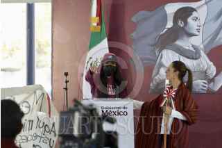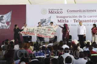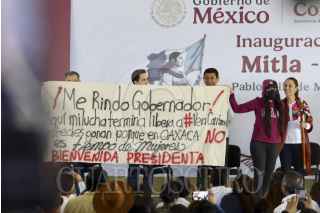 SAN PABLO VILLA DE MITLA, OAXACA, 24ENERO2025.- La saxofonista María Elena Ríos Ortiz, quien es víctima de intento de feminicidio por ataque con ácido, irrumpió en el acto de inauguración de la carretera Mitla – Tehuantepec cuando concluía la intervención de la presidenta Claudia Sheinbaum. Ríos Ortiz hizo uso del micrófono para denunciar que a casi 6 años del atentado que sufrió no ha recibido justicia, afirmó ante la presidenta “en Oaxaca las mujeres no tenemos justicia, me rindo gobernador”, dijo a Salomón Jara Cruz. FOTO: CAROLINA JIMÉNEZ/CUARTOSCURO.COM
