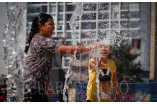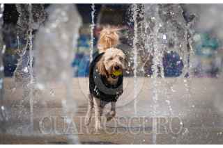 CIUDAD DE MÉXICO, 25ENERO2025.- Un perro corre con una pelota en el hocico en la fuente de la explanada de Monumento de la Revolución. FOTO: MAGDALENA MONTIEL/CUARTOSCURO.COM