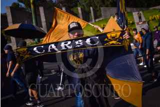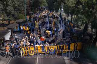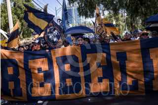 CIUDAD DE MÉXICO, 26ENERO2025.- Integrantes de la barra "La Rebel", que apoya a los Pumas de la U.N.A.M, llegan caminando en caravana al Estadio Olímpico Universitario. FOTO: PEDRO ANZA /CUARTOSCURO.COM