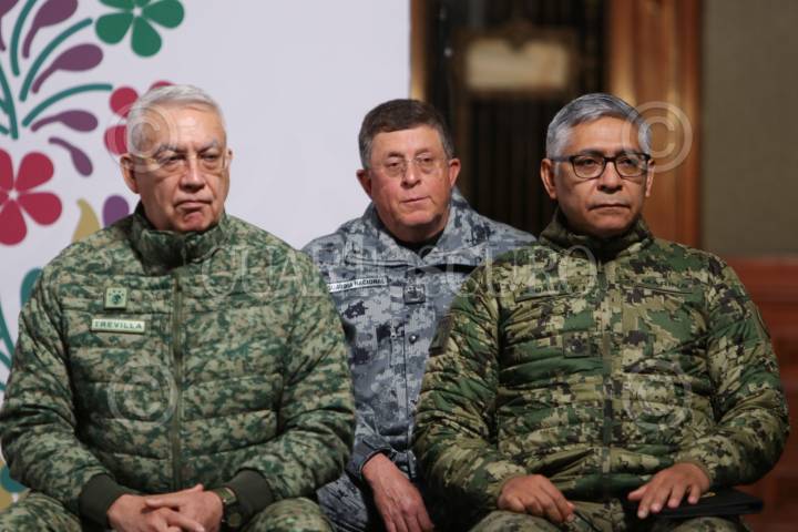 CIUDAD DE MÉXICO, 28ENERO2025.- El titular de la Secretaría de Marina (Semar), Almirante Raymundo Pedro Morales Ángeles, junto con Ricardo Trevilla, Secretario de la Defensa Nacional, y Luis Rodríguez Bucio, recientemente designado comandante de la Guardia Nacional, presentaron el informe de seguridad durante la Conferencia del Pueblo. FOTO: GUSTAVO ALBERTO /CUARTOSCURO