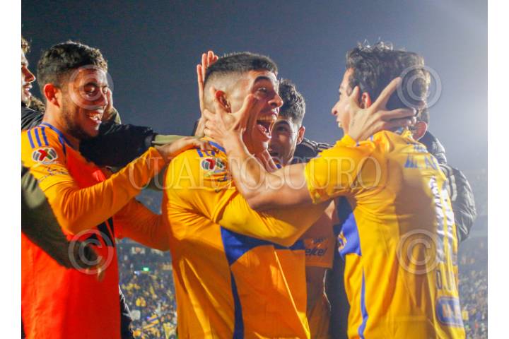 SAN NICOLÁS DE LOS GARZA, NUEVO LEÓN, 28ENERO2025.- Juan Brunetta de Tigres, festeja el gol con sus compañeros,, ante el Club Tijuana, en el estadio Universitario, partido correspondiente a la jornada 4 de la Clausura 2025 de la Liga Mx. Marcador Final: Tigres: 4 - Club Tijuana: 0. FOTO: GABRIELA PÉREZ MONTIEL / CUARTOSCURO.COM