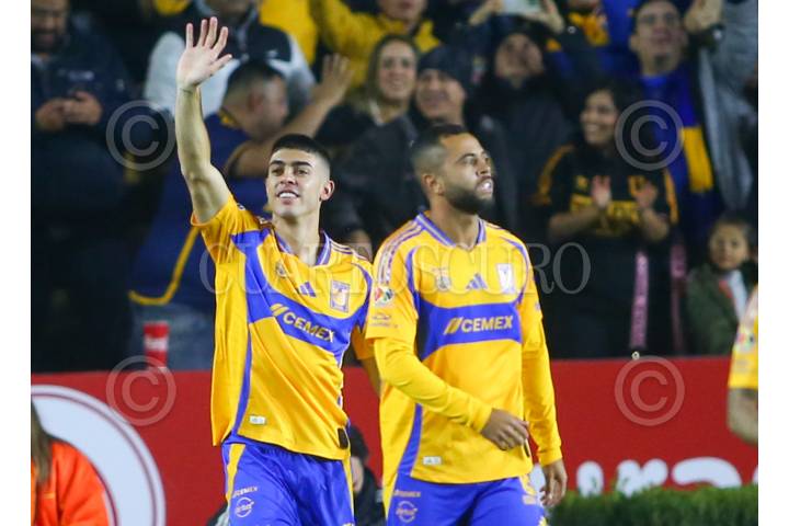 SAN NICOLÁS DE LOS GARZA, NUEVO LEÓN, 28ENERO2025.- Juan Brunetta de Tigres, festeja el gol ante el Club Tijuana, en el estadio Universitario, partido correspondiente a la jornada 4 de la Clausura 2025 de la Liga Mx. Marcador Final: Tigres: 4 - Club Tijuana: 0. FOTO: GABRIELA PÉREZ MONTIEL / CUARTOSCURO.COM