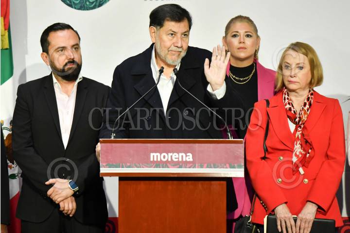 CIUDAD DE MÉXICO, 29ENERO2025.- Gerardo Fernández Noroña, diputado presidente de la mesa directiva del Senado de la República, junto a legisladores del grupo parlamentario de Morena ofreció conferencia de prensa, para referirse al proceso de insaculación para definir las candidaturas para las elecciones del Poder Judicial que se realizará mañana en el Senado de la República. FOTO: MARIO JASSO/CUARTOSCURO.COM