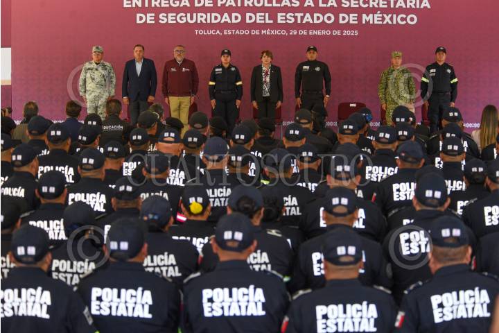 TOLUCA, ESTADO DE MÉXICO, 29ENERO2025.- Delfina Gómez Álvarez, Gobernadora del Estado de México, acompañada por Cristóbal Castañeda Camarillo, Secretaria de Seguridad, Horacio Duarte, Secretario General de Gobierno, Ricardo Moreno, Alcalde de Toluca realizó la entrega de 100 patrullas equipadas a la Secretaría de Seguridad, sumando hasta el momento 200 unidades que forman parte de la estrategia para fortalecer la seguridad pública estatal, durante este evento se guardó un minuto de silencio por los policías asesinados la noche de este martes en Malinalco; Máximo Martínez obispo auxiliar de la Arquidiócesis de Toluca bendijo las patrullas y pidió por la seguridad de los elementos estatales. FOTO: CRISANTA ESPINOSA AGUILAR /CUARTOSCURO.COM