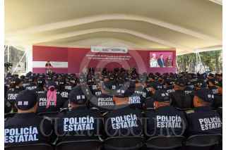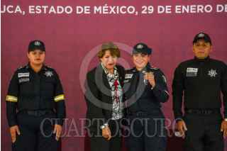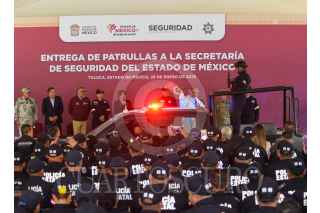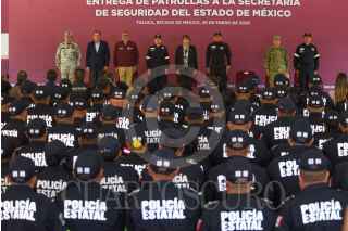 TOLUCA, ESTADO DE MÉXICO, 29ENERO2025.- Horacio Duarte, Secretario General de Gobierno y Ricardo Moreno, Alcalde de Toluca durante la entrega de 100 patrullas equipadas a la Secretaría de Seguridad, sumando hasta el momento 200 unidades que forman parte de la estrategia para fortalecer la seguridad pública estatal, durante este evento se guardó un minuto de silencio por los policías asesinados la noche de este martes en Malinalco; Máximo Martínez obispo auxiliar de la Arquidiócesis de Toluca bendijo las patrullas y pidió por la seguridad de los elementos estatales. FOTO: CRISANTA ESPINOSA AGUILAR /CUARTOSCURO.COM