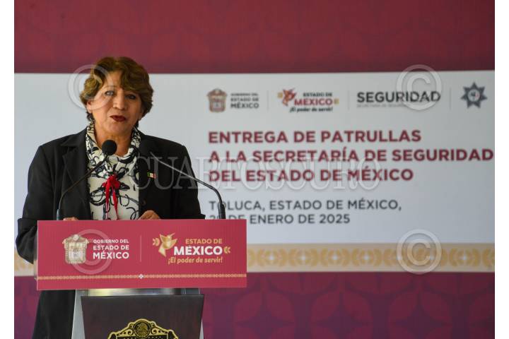 TOLUCA, ESTADO DE MÉXICO, 29ENERO2025.- Delfina Gómez Álvarez, Gobernadora del Estado de México, acompañada por Cristóbal Castañeda Camarillo, Secretaria de Seguridad, Horacio Duarte, Secretario General de Gobierno, Ricardo Moreno, Alcalde de Toluca realizó la entrega de 100 patrullas equipadas a la Secretaría de Seguridad, sumando hasta el momento 200 unidades que forman parte de la estrategia para fortalecer la seguridad pública estatal, durante este evento se guardó un minuto de silencio por los policías asesinados la noche de este martes en Malinalco; Máximo Martínez obispo auxiliar de la Arquidiócesis de Toluca bendijo las patrullas y pidió por la seguridad de los elementos estatales. FOTO: CRISANTA ESPINOSA AGUILAR /CUARTOSCURO.COM