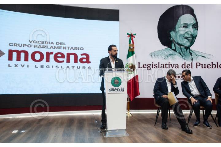 CIUDAD DE MÉXICO, 30ENERO2024.- Arturo Federico Avila Anaya, Ricardo Monreal y Sergio Carlos Gutiérrez encabezaron la presentación de “Legislativa del Pueblo” conferencias matutinas los lunes por parte de los diputados del grupo parlamentario de Morena. FOTO: ANDREA MURCIA /CUARTOSCURO.COM