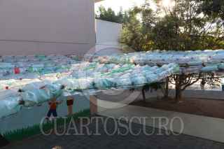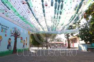 CHILPANCINGO, GUERRERO, 30ENERO2025.- Ante la falta de recurso y la tardía de respuestas por parte de las autoridades educativas ante las diversas peticiones de un techado, maestros, padres de familia y alumnos de la Escuela Primaria "Partido Revolucionario Institucional" ubicada en la colonia del PRI de Chilpancingo, colocaron un techado elaborado con botellas de pet. El techado se encuentra ubicado en una de las áreas verdes de la institución en dónde los alumnos regularmente a la hora del receso, acuden para comer y jugar. Araceli Sánchez Morales, directora de este plantel educativo, señalo que inicialmente la idea surgió a causa de que la escuela no contaba con un techado en su cancha, por lo que los alumnos tenía que tomar sus clases en el rayo del sol, posteriormente el proyecto fue trasladado a un área verde en dónde los alumnos acuden a la hora del receso a consumir sus alimentos o jugar. Relató que su edificación se desarrollo hace aproximadamente dos meses, y durante vario tiempo los padres de familia y alumnos estubieron recolectando las botellas de plástico. Sánchez Morales, señalo que su construcción obviamente favorece al alumnado, pero también favorece al medio ambiente y a raíz de esto la institución a tomado una cultura más amplia sobre el cuidado al medio ambiente. FOTO: DASSAEV TÉLLEZ ADAME/CUARTOSCURO.COM