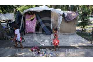 TAPACHULA, CHIAPAS, 30ENERO2025.-Niños juegan en lo que fue un campamento migrante en la frontera Sur. Personal de servicio publico recoge platicó y palos que era usado para formar chozas donde se quedaban a descansar. Autoridades del Instituto Nacional de Migración (INM), Protección Civil (PC) y policía Municipal desalojan a 12 familias migrantes de manera pacifica. FOTO: DAMIAN SÁNCHEZ/CUARTOSCURO.COM