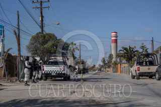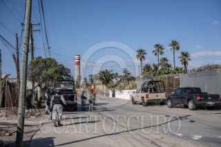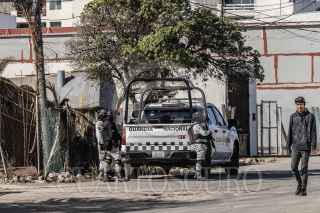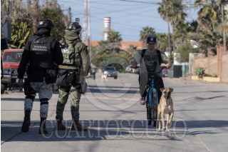 ROSARITO BAJA CALIFORNIA 31ENERO2025.-Hombre a bordo de una bicicleta y un perro pasando frente a agentes de la Guardia Nacional. La Fiscalía General de la República decomisó alrededor de 4 mil 171 kilogramos de sustancia ilegal conocida como cristal que fueron localizados en 3 mil 209 cajas rotuladas para comida de perro y gato, dentro de la caja de un tractocamión sin razón social. Tras esperar autoridades la orden de cateo, elementos de la Guardia Nacional y Ejército Mexicano permanecieron custodiando por varios días un domicilio ubicado sobre la calle Camino Viejo Pemex en el municipio de Playas de Rosarito. Fue hasta la madrugada de este viernes 31 de enero, que agentes de la FGR tras hacer el cateo, decomisaron la droga, así como un una réplica de arma de fuego tipo pistola de pistas y 58 cartuchos calibre en 12mm y 6 cartuchos 20mm. hacia las instalaciones de la Fiscalía, ubicadas en Zona Río en Tijuana. Vecinos de la zona, aseguraron que desde hace días, autoridades se encontraban cercano a la zona del cateo, haciendo revisiones en los vehículos que circulaban por el área. El Secretario de Seguridad Publica en México, Omar García Harfuch, dio a conocer que través de un operativo a la par, también se aseguró en Sonora a dos hombres que transportaban paquetes con aproximadamente 20 kilogramos de fentanilo y heroína. FOTO: OMAR MARTÍNEZ/CUARTOSCURO.COM
