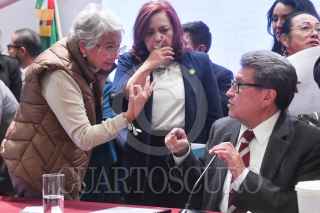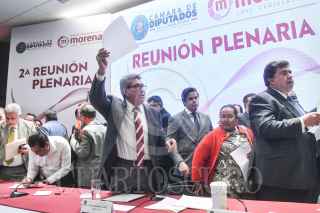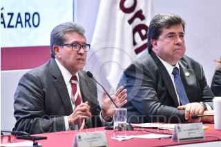 CIUDAD DE MÉXICO, 31ENERO2025.- Ricardo Monreal, coordinador del grupo parlamentario de Morena, al finalizar la segunda reunión plenaria del grupo parlamentario de Morena previo al segundo periodo de sesiones ordinarias de la LXVI Legislatura, leyó y solicitó firmar a los legisladores un pronunciamiento de apoyo a las decisiones que Claudia Sheinbaum, presidenta de México, tome ante la posible aplicación del 25?aranceles a productos importados de México por parte del gobierno de Donald Trump, presidente de los Estados Unidos. En la imagen, Pedro Haces, acompaña al coordinador parlamentario. FOTO: MARIO JASSO/CUARTOSCURO.COM