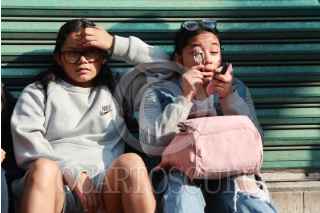 CIUDAD DE MÉXICO, 01FEBRERO2025. Una mujer se maquilla junto a su amiga, mientras toman el sol en una mañana fría en calles de la Ciudad de México. FOTO: EDGAR NEGRETE LIRA/CUARTOSCURO.COM