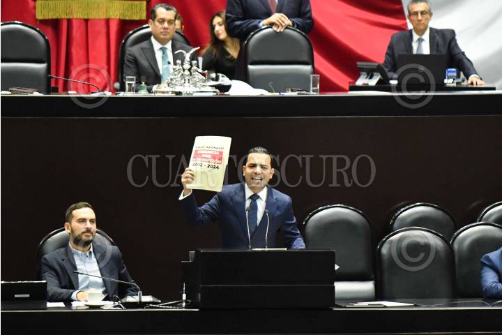 CIUDAD DE MÉXICO, 01FEBRERO2025.- Elías Lixa, diputado y coordinador del PAN en la Cámara baja, muestra un folder con la presunta denuncia de corrupción en INFONAVIT en el periodo 2012-2024, durante la sesión ordinaria del Segundo Año de Ejercicio de la LXVI Legislatura del Congreso de la Unión de la Cámara de Diputados en la que se comenzó la discusión de la reforma al INFONAVIT. FOTO: MARIO JASSO/CUARTOSCURO.COM