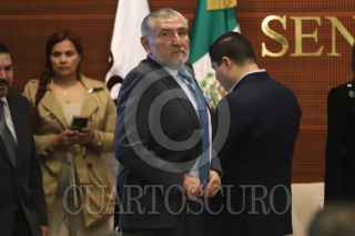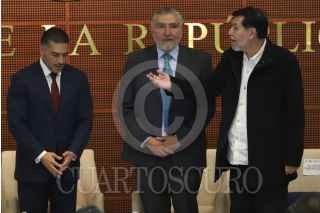 CIUDAD DE MÉXICO, 04FEBRERO2025.- Gerardo Fernández Noroña y Adán Augusto López recibieron esta tarde a Omar García Harfuch secretario de Seguridad, para la reunión que sostendrán como parte de la segunda plenaria de Morena. FOTO: DANIEL AUGUSTO/ CUARTOSCURO.COM