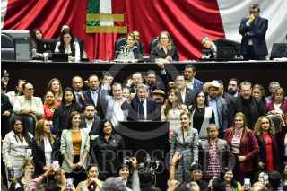 CIUDAD DE MÉXICO, 05FEBRERO2025.- , Ricardo Monreal, diputado y coordinador de Morena, junto a sus compañeros de bancada, durante la sesión ordinaria de la Cámara de Diputados, en la que los partidos políticos ofrecieron comentarios relativos a la situación de la relación entre México y Estados Unidos. FOTO: MARIO JASSO/CUARTOSCURO.COM