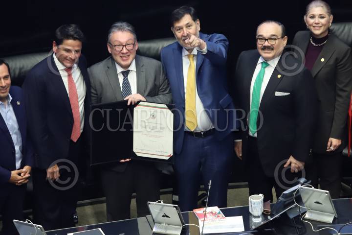 CIUDAD DE MÉXICO, 05FEBRERO2025.- José Gabriel Cuadras es designado como nuevo su gobernador del Banco de México, el presidente de la Mesa Directiva del Senado, Gerardo Fernández Noroña, le entrega su constancia que lo acredita en su cargo hasta el 2032. FOTO: DANIEL AUGUSTO/ CUARTOSCURO.COM