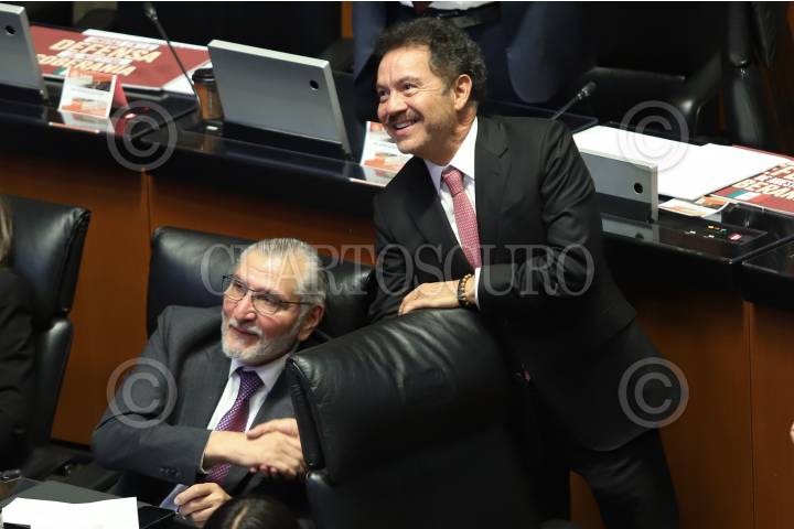 CIUDAD DE MÉXICO, 05FEBRERO2025.- Los morenistas Adán Augusto López e Ignacio Mier celebran la aprobación de la lista de candidatos a ocupar los cargos vacantes dentro del Poder Judicial que el Poder Legislativo propuso a través del proceso de insaculación. FOTO: DANIEL AUGUSTO/ CUARTOSCURO.COM