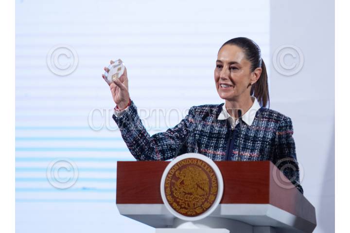 CIUDAD DE MÉXICO, 06FEBRERO2025.- Claudia Sheinbaum Pardo, presidenta de México muestra chip parte de la operación del Centro Nacional de diseño de semiconductores durante conferencia de prensa en Palacio Nacional. FOTO: ANDREA MURCIA /CUARTOSCURO.COM