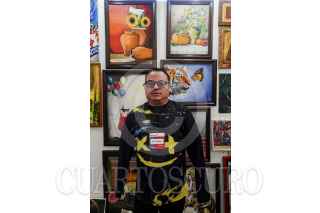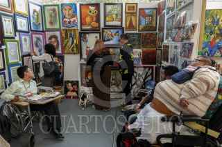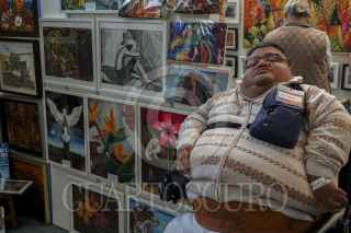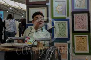 CIUDAD DE MÉXICO, 06FEBRERO2025.- El joven artista Jesús García, integrante de la Asociación de Pintores con la Boca y el Pie (APBP) posa junto a algunas de sus obras durante la 5ta edición del Festival de Arte BADA en el Campo Marte. García ha cumplido 5 años en el medio artístico y comenta que tarda hasta 3 meses en terminar una de sus obras con alrededor de seis o siete horas de trabajo diarias. FOTO: GALO CAÑAS/CUARTOSCURO.COM