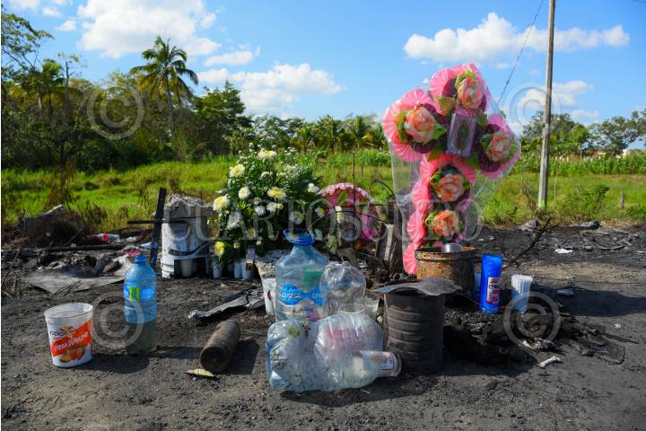 ESCÁRCEGA, CAMPECHE, 09FEBRERO2025.- Escena desolador donde ocurrió el trágico accidente en el kilómetro 170 de la carretera Escárcega-Villahermosa, donde un autobús de pasajeros y un tráiler colisionaron, dejando un saldo de 33 personas fallecidas y 9 heridas de gravedad. En el lugar del siniestro, aún se observan restos de los vehículos involucrados, así como objetos y restos de lo que seria las personas calcinadas junto a ellas veladoras y flores colocadas en memoria de las víctimas. FOTO: MICHAEL BALAM/CUARTOSCURO.COM