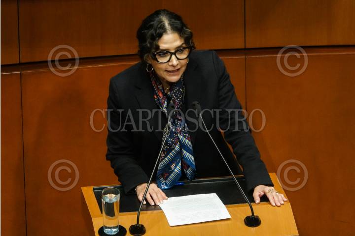 CIUDAD DE MÉXICO, 11FEBRERO2025.- La senadora emecista Alejandra Barrales hace uso de la tribuna durante la sesión ordinaria de la Cámara de Senadores en el marco de la LXVI Legislatura. FOTO: GALO CAÑAS/CUARTOSCURO.COM