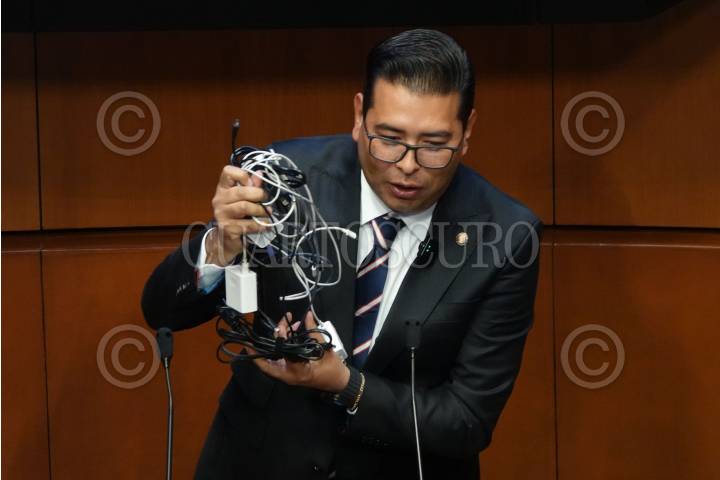 CIUDAD DE MÉXICO, 11FEBRERO2025.- El senador priista Néstor Camarillo Medina muestra cargadores mientras usa la tribuna durante la sesión ordinaria de la Cámara de Senadores en el marco de la LXVI Legislatura. FOTO: GALO CAÑAS/CUARTOSCURO.COM