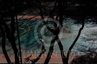 CIUDAD DE MÉXICO, 12FEBRERO2025.- Un trabajador de limpia barre una de las canchas ubicadas en la Unidad Habitacional Tlatelolco. FOTO: DANIEL AUGUSTO/ CUARTOSCURO.COM