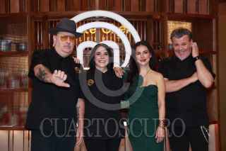CIUDAD DE MÉXICO, 12FEBRERO2025. Adrián Herrera, Zahie Téllez, Claudia Lizaldi y Ponchó Cadena durante la presentación del programa de MasterChef México que celebra una década con una nueva temporada llamada “MasterChef Celebrity Generaciones”, a transmitirse por TV Azteca. FOTO: EDGAR NEGRETE LIRA/CUARTOSCURO.COM