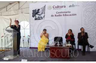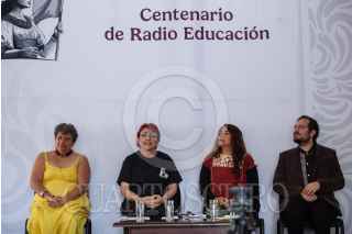 CIUDAD DE MÉXICO, 13FEBRERO2024.- Loredana Montes López, directora general del fidecomiso del Centro Histórico; María Fernanda Tapia Canovi, directora de Radio Educación; Azucena Pimentel Mendoza, directora de la red Nacional de Medios Públicos y Alonso Millán Zepeda, director del canal 22 donde presentaron la convocatoria del Centenario de Radio Educación. FOTO: ANDREA MURCIA /CUARTOSCURO.COM
