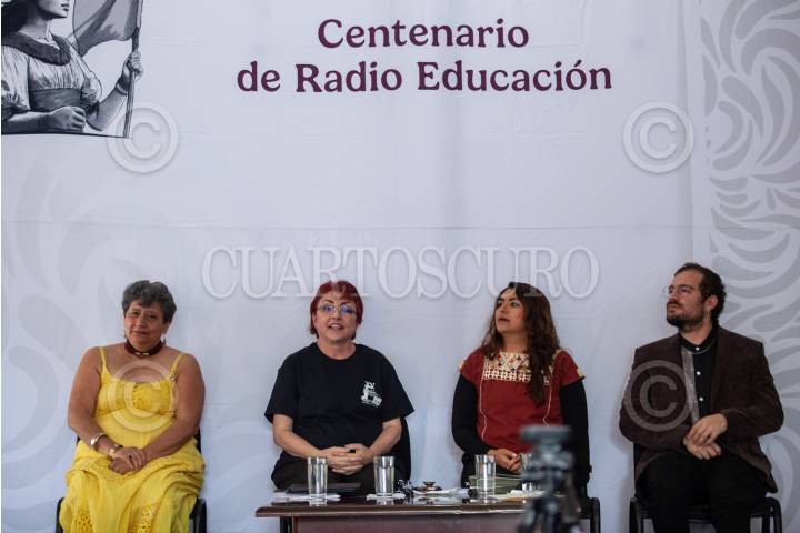CIUDAD DE MÉXICO, 13FEBRERO2024.- Loredana Montes López, directora general del fidecomiso del Centro Histórico; María Fernanda Tapia Canovi, directora de Radio Educación; Azucena Pimentel Mendoza, directora de la red Nacional de Medios Públicos y Alonso Millán Zepeda, director del canal 22 donde presentaron la convocatoria del Centenario de Radio Educación. FOTO: ANDREA MURCIA /CUARTOSCURO.COM