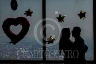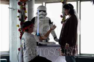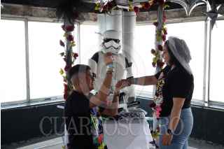 CIUDAD DE MÉXICO, 14FEBRERO2025.- Parejas jóvenes se dieron cita en el piso 35 De la Torre Latinoamericana para participar en las tradicionales “Bodas en las alturas” con la temática de películas. Fue así que un “stormtropper” de la saga de la Guerra de las Galaxias, o bien, el Dr. Brown de Volver al futuro oficiaron las ceremonias. FOTO: GALO CAÑAS/CUARTOSCURO.COM