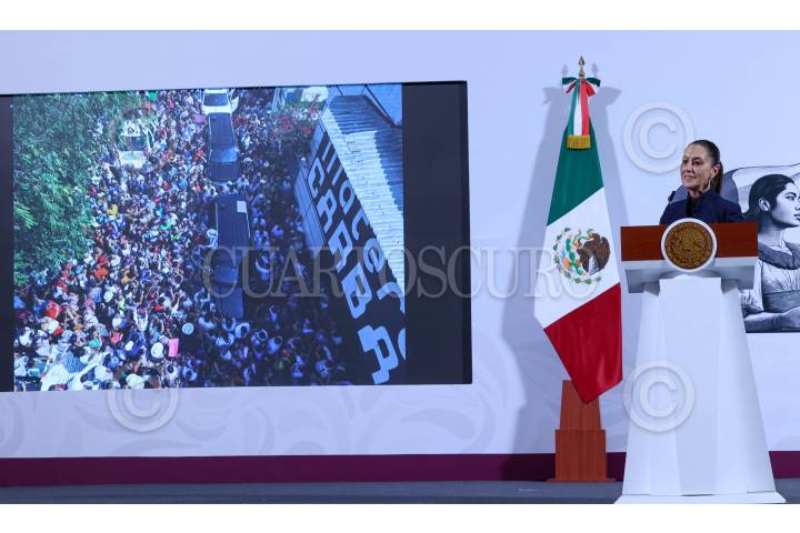 CIUDAD DE MÉXICO, 17FEBRERO2025.- Claudia Sheinbaum, Presidenta de México, habló sobre la eliminación del examen para que estudiantes ingresen a la Educación Media Superior, lo que califico de muy bueno, ya que se busca no estigmatizar a los jóvenes y centros de estudios, durante la mañanera. En la imagen la Jefa del Ejecutivo muestra una foto de su gira por Veracruz, en la cual su camioneta está rodeada por cientos de simpatizantes. QFOTO: MOISÉS PABLO/CUARTOSCURO.COM