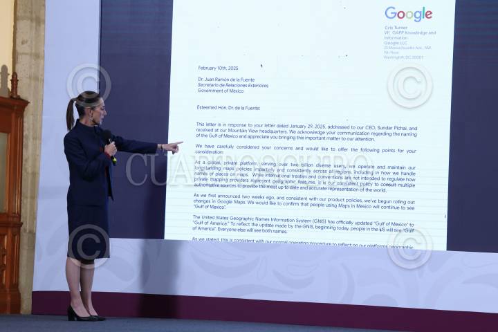 CIUDAD DE MÉXICO, 17FEBRERO2025.- Claudia Sheinbaum, Presidenta de México, muestra la carta que Google le mando tras pronunciarse sobre el cambio en sus mapas de Golfo de México por Golfo de América, esto tras el decreto de Donald Trump, quien al asumir su Presidencia firmo un decreto para hacer este cambio. La Jefa del Ejecutivo insistió que el decreto solo aplica a la zona marítima de las costas de Estados Unidos y no los territorios de México y Cuba, por lo que el canciller mexicano volvió a mandar otra carta para que Google precise este dato. FOTO: MOISÉS PABLO/CUARTOSCURO.COM