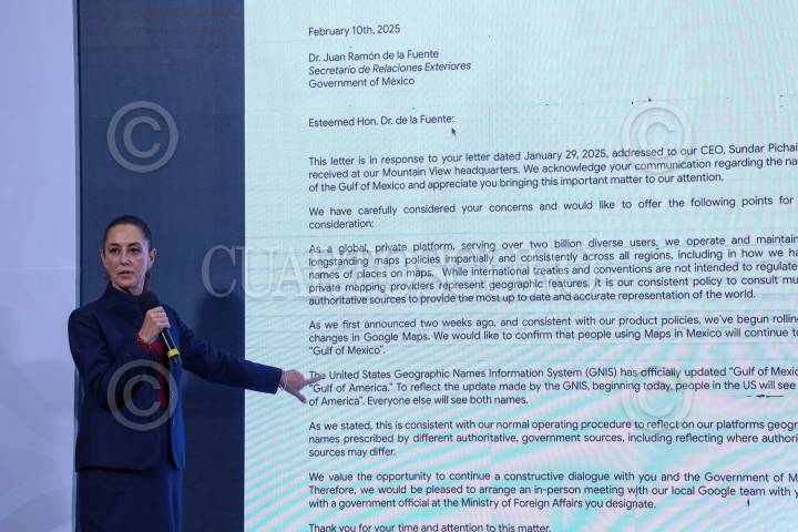 CIUDAD DE MÉXICO, 17FEBRERO2025.- Claudia Sheinbaum, Presidenta de México, muestra la carta que Google le mando tras pronunciarse sobre el cambio en sus mapas de Golfo de México por Golfo de América, esto tras el decreto de Donald Trump, quien al asumir su Presidencia firmo un decreto para hacer este cambio. La Jefa del Ejecutivo insistió que el decreto solo aplica a la zona marítima de las costas de Estados Unidos y no los territorios de México y Cuba, por lo que el canciller mexicano volvió a mandar otra carta para que Google precise este dato. FOTO: MOISÉS PABLO/CUARTOSCURO.COM