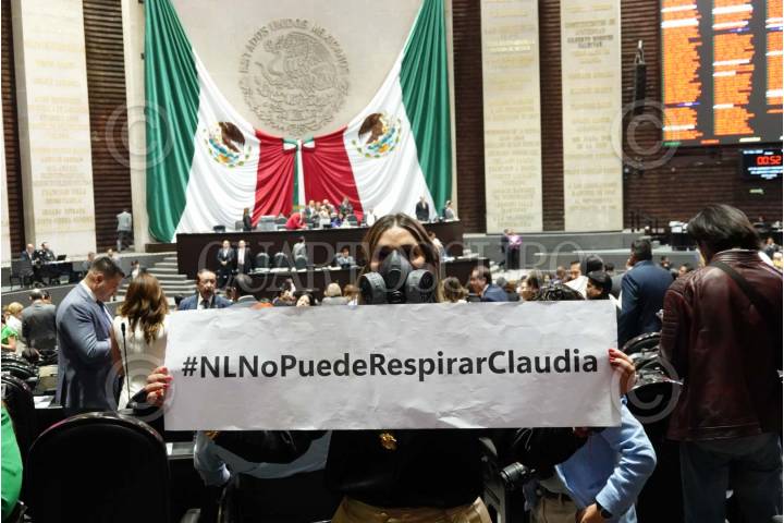 CIUDAD DE MÉXICO, 18FEBRERO2025.- La diputada Anita González (PRI), protestó por la contaminación que se presenta en el estado de Nuevo León durante la Sesión Ordinaria en la Cámara de Diputados. FOTO: GRACIELA LÓPEZ/CUARTOSCURO.COM