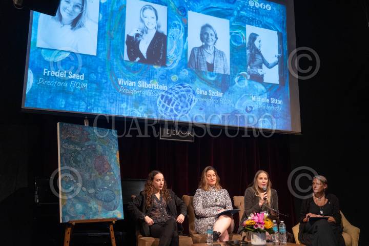 CIUDAD DE MÉXICO, 18FEBRERO2025.- Michelle Sitton, artista plástica; Fredel Saed, directora de la Feria Internacional de Cine Judío en México; Vivian Silbertein, presidenta de la Feria Internacional de Cine Judío en México; y Gina Szclar, promotora del FICJM, durante la presentación del 22 Festival Internacional de Cine Judío en México el cual se llevará acabo del 20 de febrero al 19 de marzo y en esta edición también tendrá presencia en Panamá, Costa Rica y España. FOTO: MOISÉS PABLO/CUARTOSCURO.COM