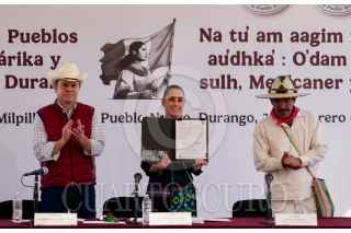 PUEBLO NUEVO, DURANGO, 21FEBRERO2025.- Claudia Sheinbaum, presidenta de México, durante el evento protocolario de "Plan de Justicia" para Pueblos O'dam, Au'dam, Wixárika y Mexikan de Durango. FOTO: PRESIDENCIA/CUARTOSCURO.COM