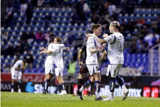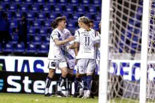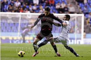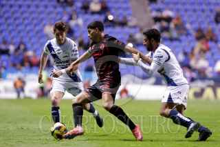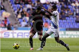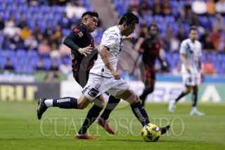 PUEBLA, PUEBLA, 21FEBRERO2025.- Joe Corona y Raúl Castillo durante el partido entre el Club Puebla y los Xolos de Tijuana, correspondiente a la jornada 8 del torneo Clausura 2025 de la Liga BBVA MX, celebrado en el Estadio Cuauhtémoc. FOTO: MIREYA NOVO/ CUARTOSCURO.COM